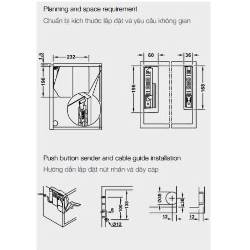 - Điều chỉnh: Cánh tủ mặt trước: Chiều cao/cạnh/góc nghiêng ±1,5 mm
