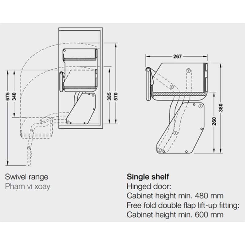 Thông số kỹ thuật của kệ nâng hạ cho tủ bếp rộng 600mm, 1 khay, Hafele 504.68.913